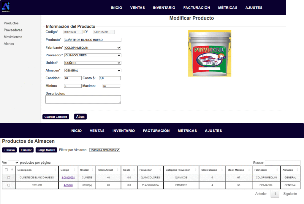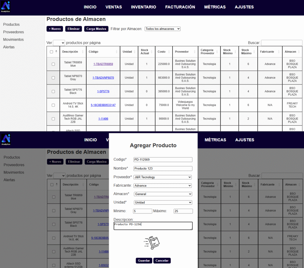 Nuestra plataforma de gestión de inventario permite a tu empresa tener un control completo y en tiempo real de los productos en almacén, con herramientas intuitivas para agregar, editar y organizar artículos de forma sencilla. Desde la carga masiva de productos hasta la actualización de proveedores, costos, stock mínimo y máximo, todo se gestiona en un solo lugar para optimizar procesos y ahorrar tiempo. Con esta solución, podrás centralizar la información de tus inventarios, evitar pérdidas por falta de control, mejorar la toma de decisiones y garantizar la disponibilidad de productos para tus clientes. Es la herramienta ideal para negocios que buscan eficiencia, orden y crecimiento sostenible a través de la tecnología.
