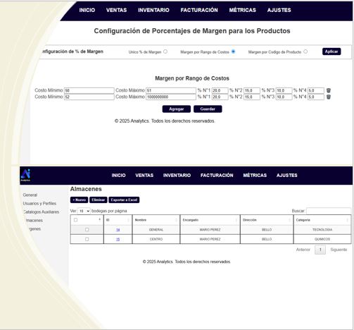 Nuestra plataforma no solo centraliza la gestión de inventarios, sino que también te permite configurar márgenes de ganancia de manera personalizada según rangos de costos, garantizando un control estratégico de la rentabilidad de tu negocio. Con un sistema flexible y fácil de usar, podrás ajustar precios de venta automáticamente, administrar múltiples almacenes y optimizar la distribución de productos en diferentes sedes o bodegas. Todo esto en una sola herramienta que simplifica la gestión operativa, mejora la toma de decisiones y maximiza tus beneficios con precisión y eficiencia.